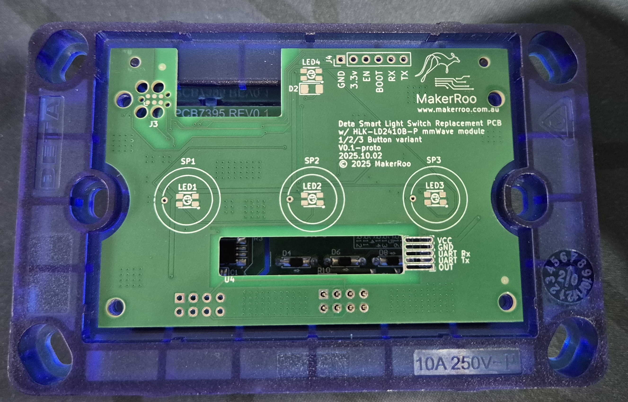 Quick recap for anyone landing fresh: SwitchRoo is a drop-in replacement PCB for Australian smart light switches (starting with Deta). It brings ESP32-C series chips for future Zigbee/Thread support, optional mmWave radar presence detection, and RGB LEDs on each button - all running locally on ESPHome.